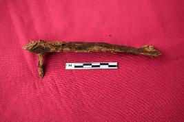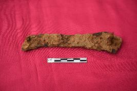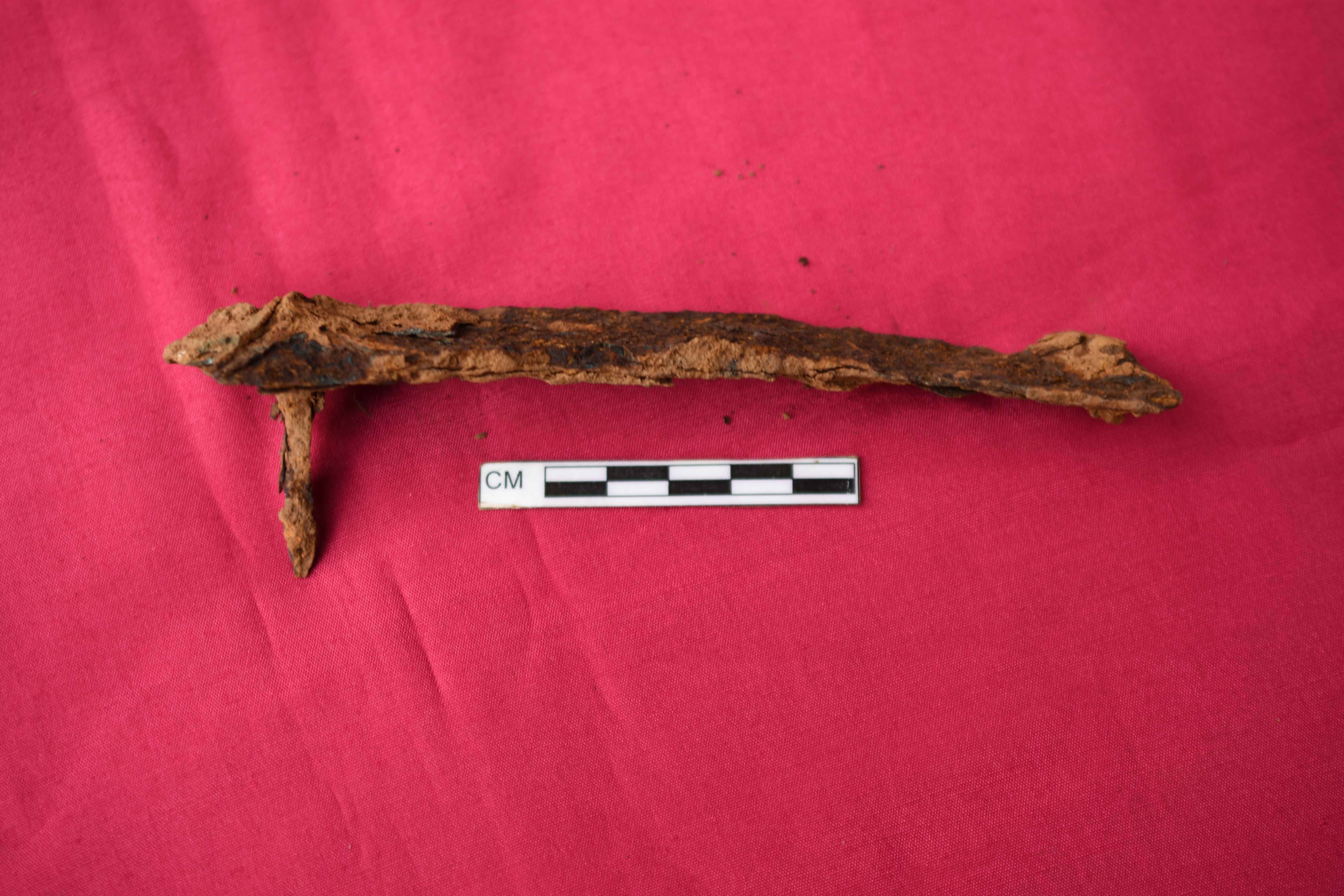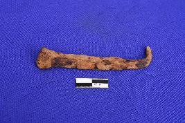 A corroded Iron clamp with broad body and flat end. Most probably used for wooden doors. Originally, it had two iron nails attached perpendicularly to strengthen the wooden doors.
