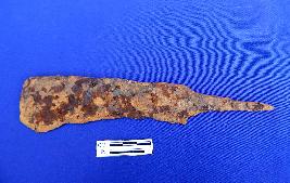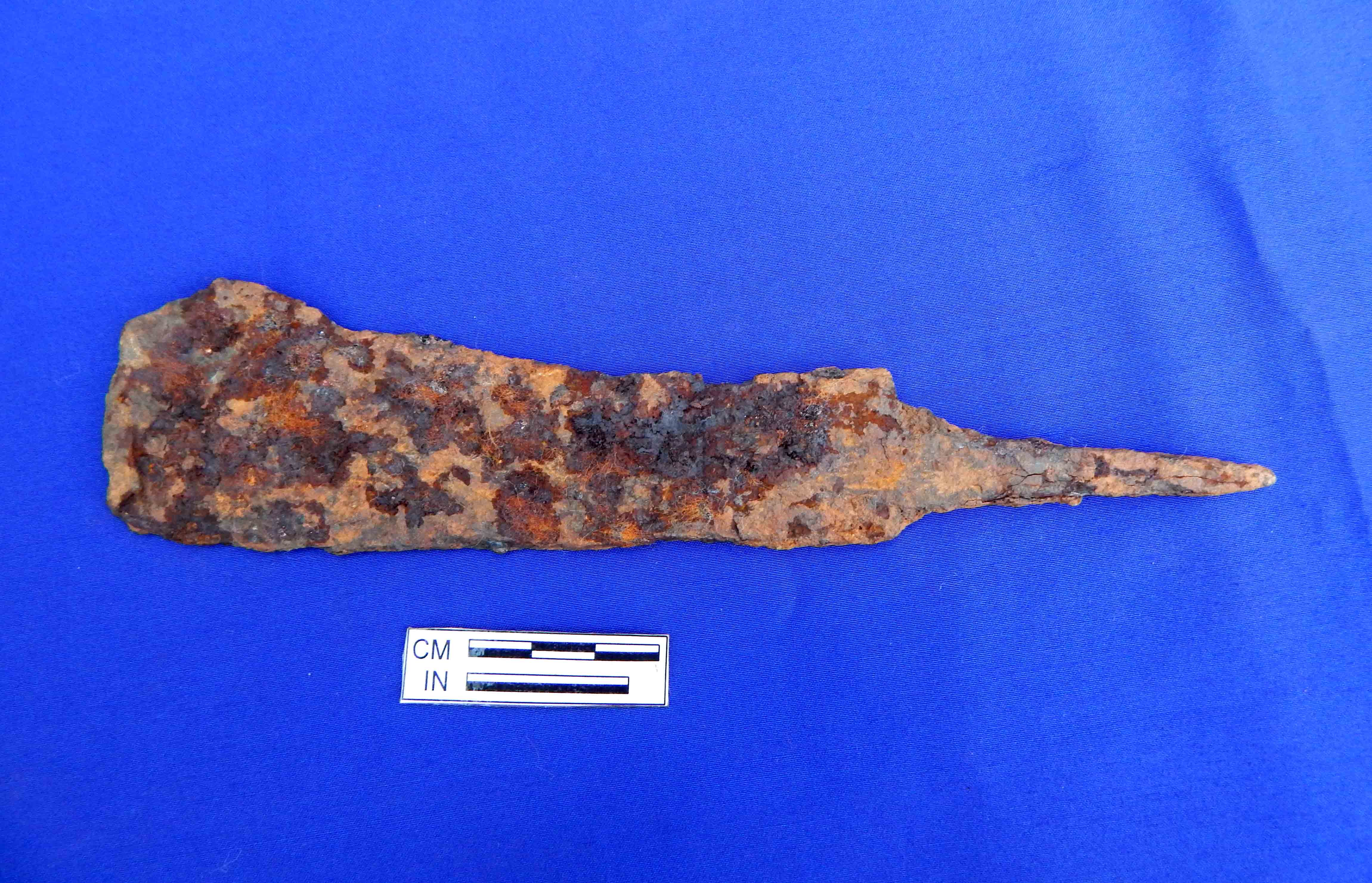 A heavily corroded iron knife fragment with a single edge of the elliptical section, while the tang is rectangle in section.