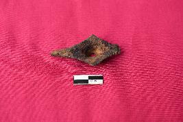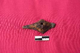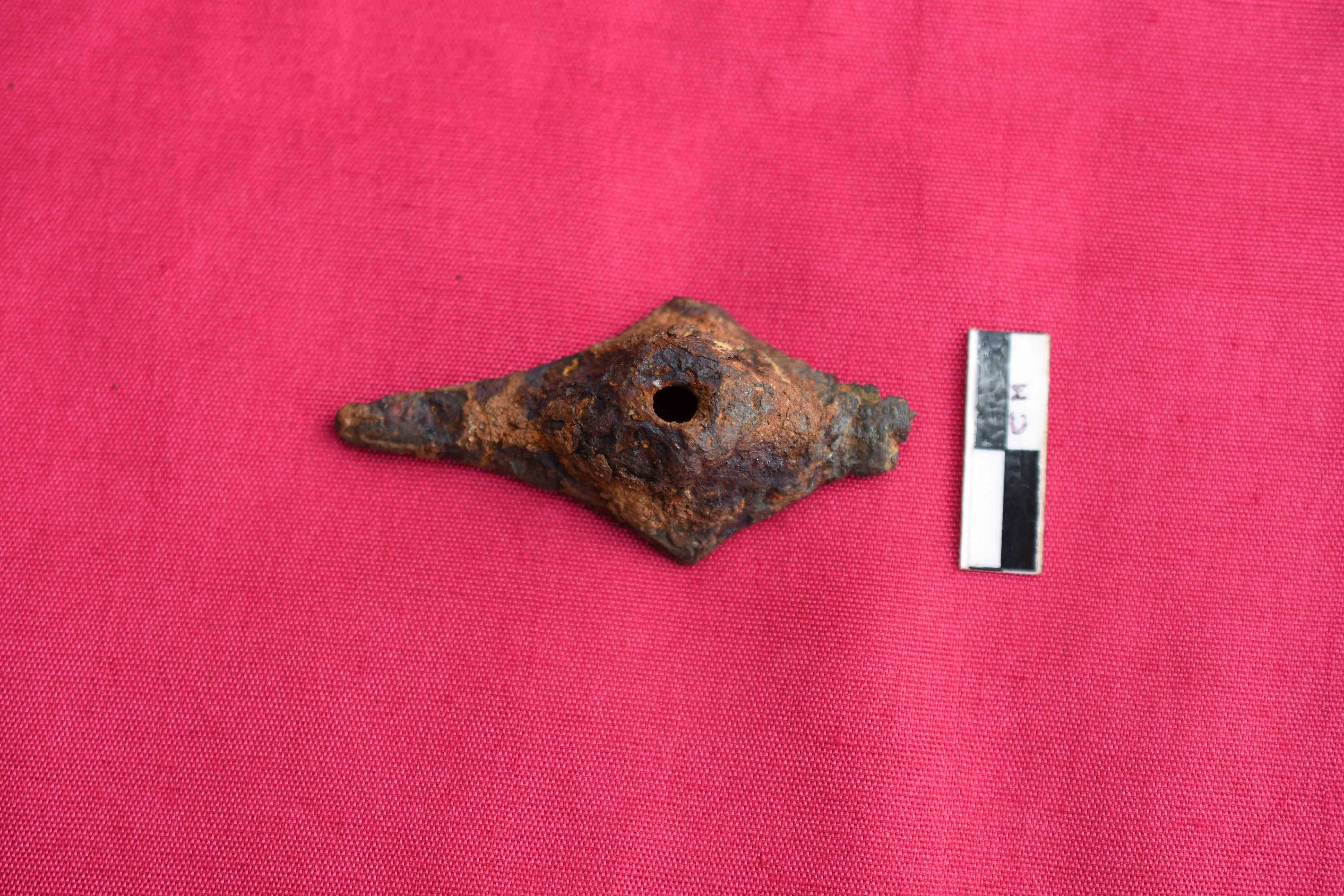 It is an unidentified diamond shaped object most probably a bolt for wooden doors with long squarish body. It has projected hemispherical body at the center with perforation. Its square body has pointed ends.