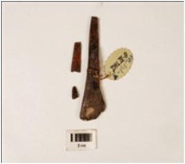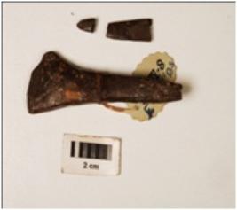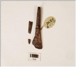 | Description / विवरण | Fragment of iron nail, pointed end, flat fan shaped top, flat surface, rusted, proper edges, layer of wax is visible, chipped off from bottom. |