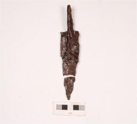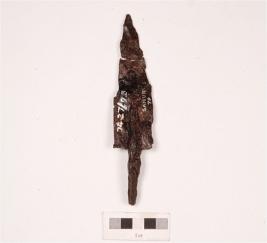| Description / विवरण | A broken piece of iron arrow head, top portion is broken, surface is rusted. |