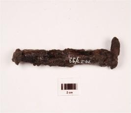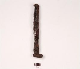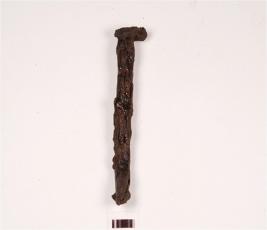 | Description / विवरण | An iron nail, rectangular head, cracks on surface, and rusted surface. |