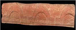 Fragment of a coping having six three on each side semi circular - arched niches. The symbols are described in the following way - A - Nagarushpa honeysuckle B - Maladam C - Floral motif. Back side - D - Nagapushpa E - Madadam F - Floral motif There are 4 slots on bottom face of on one side. Dowel is provided on one side.
