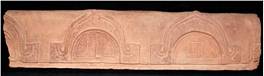 The fragment of a coping stone containing total total semicircular niches in both sides enclosing arched moulding and contains auspicious symbols. Front face - A - Window or vatayana. B - Floral motif. Black face - A - Elevation of a stupa with main gate. B - window or vatayana.