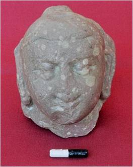 This head is shown with features like nose, eyes, lips, ear. On top of head in the centre is broken. It might be Ushnisha, which is broken now if it is so, then it mght be Buddha head.