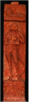 The sculpture represents the standing figure of a nude lady. Her face turns to the right. Her two hands hold her hair. The sculpture is shown as if she has finished her bath and is now squeezing her hair to left the drop of water. A swan has been shown beside her left foot taking the tip of her wet tresses in its back. The lady wears few ornaments like anklets, two tired girdle or mekhala, wristlet or valaya, bangles on kankona ear rings. The back is edcorated with lotus medallions.