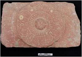 Side A- 8 petalled lotus design having four levels. I - The sepals of the carlyx in triangular shape between the petals. II - 8 petals with broad spatulate tips. III - The concentric circle shows the androecium having thirty-three anther lobes. IV - The raised disc represents the gynoecium with its styles, stigmas ovaries. Side B- An 8 petalled lotus design having two levels. I- 8 petals having broad pointed petals spatulate petals alternatively. II-The middle disc is divided into four quadrants by a cross. Each quadrant again is divided into two by its angular bisector. Each part represents on anther lobe the lines reprents the filament.