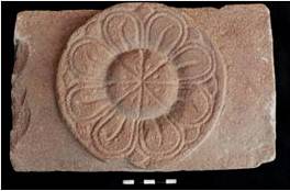 Side A- 8 petalled lotus having levels. I - The sepals are in triangular shape. II - 8 petals having broad spatulate tips. III - The raised disc has both the androecium and 8 anther lobes in shape of finger tips. IV - The gynoecium with its stylus and stigmas. Side B- An 8 petalled lotus design having three levels. I - Sepals in trangular shape between each petals. II - There are 8 petals with long broad spatulate tips narrow base. III - The raised disc having 8 triangular compartment.
