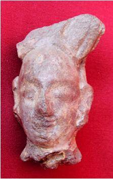 The oval shaped male head having sharp nose, elongated eyes, thick lip and elongated eyes. It wears a crown on its head as evident from its remains.