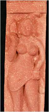 A female is shown standing under the tree on a dwarf holding an unidentified object in her right hand. With the left hand she holds the falls of her sari. Two Kirtimukhaj are shown on her top. Lotus medallion at the back side of pillar.
