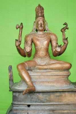 | Description / विवरण | Siva seated on the rectangular pedeseatal. Siva sitting on padma peetam with left leg folded and right leg in hanging position. Having four hands. Upper hands carrys mazhu and deer. The lower hands in abhaya and varadha posture. Wearing jata makuta. |
