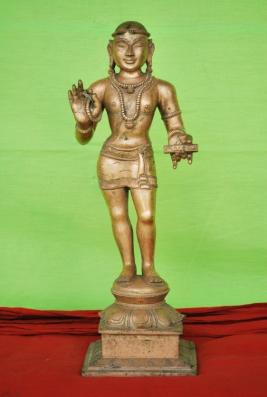 | Description / विवरण | Standing on square and padma peetam. Two hands. Right hand in Viyakyana mudra and left hand carry palm-leaf manuscript. It is found with an inscription thiruvasagam Shaved head with Rudraksha garland. Ears are provided with Rudraksha kundala |