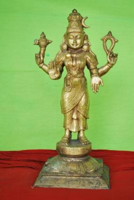 | Description / विवरण | Standing on padma peetam. Four hands. Upper hands carry Ankusa and Pasa. Lower hands in Abhaya and Varadha posture. Prominent ear holes. Moon is found in the head dress. |