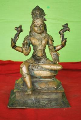 | Description / विवरण | Sitting on Padma peetam . Left leg in folded form and the right leg in hanging posture. Four hands. Upper hands carry axe and deer. Lower hands in Abhaya and varadha pose. Moon is found in the Jada Makutam. |