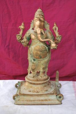 | Description / विवरण | Standing on padma peetam. Four rings are found in the corners of the square pedestal. The provision for inserting Tiruvasi in the right side is missing. Four hands. Upper hands carry Ankusa and Pasa. Lower hands carry broken tusk and fruit. Big belly. Wearing karanta makuta on the head. |