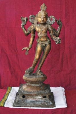 | Description / विवरण | Standing on Padma peetam with Tribhanga pose. Wearing sandals in the foot. Four hands. Upper right hand carrys Damaru and lower hands carry flower and kapala |