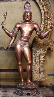 | Description / विवरण | Siva standing on Padma peedam. Jata Makutam. Four hands. Upper hands hold Parasu 9axe and deer. Lower left hand in Abhaya mudra and right hand in a posture of holding the hand of Uma. |
