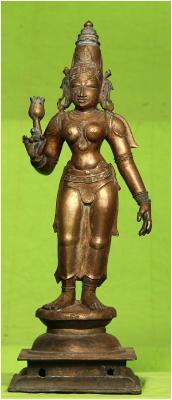 | Description / विवरण | Standing on padma peetam. Head dress with karanda makutam. Ears with makara kundalam. Two hands. Right hand holding flower and left hand in lola hastha posture. |