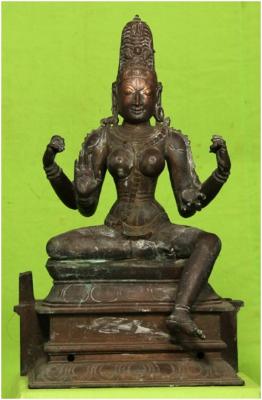 | Description / विवरण | Devi sitting on padma peedam. Head dress with jada makutam. Protruding teeth in the mouth. Four hands. The Ayudhas in the upper hands are absent. Skull garland run over the chest. Guja Bhandam is a snake. The lower right hand with Abhaya pose and left hand with kapala. Right leg is folded and left leg is in hanging posture. |
