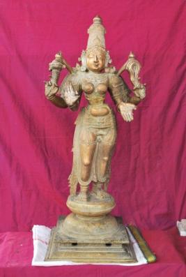 | Description / विवरण | Standing on padma peetam with four hands. Her upper hands carry Ankusa and Pasa. Her lower hands are in Abhaya and Varadha pose. Jata makutam on the head. The dropery is from the waist up to the leg. |