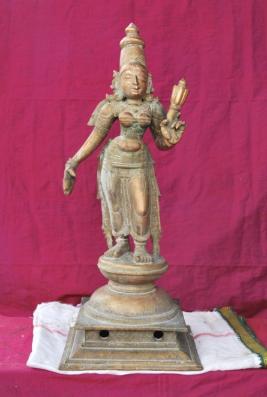 | Description / विवरण | Standing on padma peetam with two hands. The left hand carry a flower and thew right hand is in lola hastha posture. Wearing kirita Makuta on the head. |