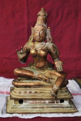 | Description / विवरण | Sitting on Padma peetam with right leg folded and the left leg in hanging position. Having two hands. The right hand in Kataka mudra and the left hand in Varadha mudra. |