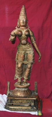 | Description / विवरण | Standing on padma peetam with two hands. The right hand in lola hastha posture. Wearing Karanta Makuta on the head. |