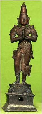 | Description / विवरण | Standing on padma peetam with anjali hastha posture. Keerita makuta on the head. The method of wearing garment is similar to sculpture of Nayak period. |