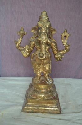 | Description / विवरण | Standing 4 hands- parasu, pasa, tusk and motaga, trunk hold a pot kalasa |