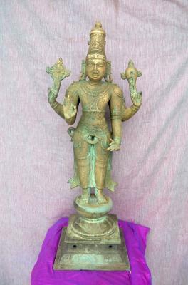 | Description / विवरण | Standing in samabhanga on a padma peetam. Having 4 hands- chakra, chank, abhaya and katyavalampitha. Lower garments. Wearing Kirita Makutam. |