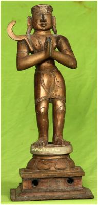 | Description / विवरण | Standing on padma peetam with anjali hastha posture. A sickle is found on the right shoulder. |