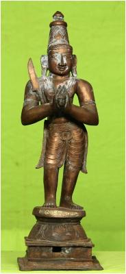 | Description / विवरण | Standing on padma peeta with Anjali Hastha in posture. A head is found in the folded hands. A knife is found on the shoulder. Wearing kirita makuta. |