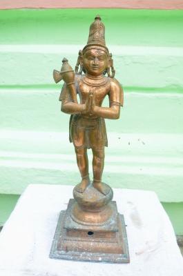 | Description / विवरण | Standing in abhanga posture on a padma peetam. Wearing jata makuta. 2 hands in anjalai pose. The parasu is rest on the right shoulder. Long ears. Lower garments. |