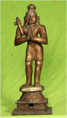 | Description / विवरण | Standing on padma peedam with anjali hastha posture. An axe 9mazhu is found on the right shoulder. The hair style with bun shaped head dress. |