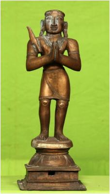 | Description / विवरण | Standing on padma peetam with anjali hastha posture. A knife is found on the right shoulder. |