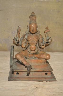 | Description / विवरण | sitting in sugasana, jata makuta 4 hands parasu, antelope, abhaya and simha hasta. |