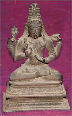 | Description / विवरण | Sitting on padma peetam with Padmasana pose. Wearing jata makuta on the head. Four hands. Upper two hands with sula and kapala and the lower right hand in Vyagna mudra. This is an important aspect of a form of Pasupatha cult |