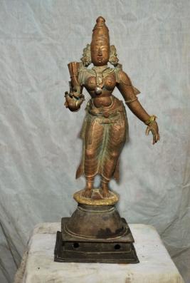 | Description / विवरण | Standing on padma peetam. Having two hands. The left hand carries a flower and the right hand in lola hastha pose. |