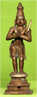 | Description / विवरण | Standing on padma peetam with anjali hastha posture. A knife is found on the right shoulder. Wearing jata makutam on the head. |