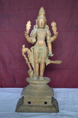 | Description / विवरण | Standing on a padma peetam in tiribanga style. Having four hands. right side hand carry vajram. left hand carry a trisul and right side other hand abaya mudra. having a karanda makuta, more ornaments. peacock standing on the back side of the murugan and snake is below the murugam foot. |