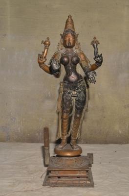 | Description / विवरण | Standing in tribangha . Karanta makuta. 4 hands right parasu left pasa right abhaya and left varadha. Devoid of kujabhanda |