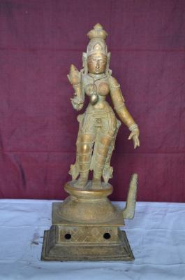 | Description / विवरण | Standing on a padma peetam in tiribanga style. Having two hands. right side hand carry flower. having a grita makuta, more ornaments. |