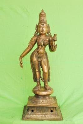 | Description / विवरण | Standing on padma peetam with two hands. Left hand carry flower and right hand in lola hastha pose. Wearing kirita makutam on the head. |