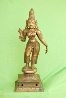 | Description / विवरण | Standing on padma peetam with two hands. Right hand carry a flower and the left hand in lola hastha pose. Wearing kirita makuta. |