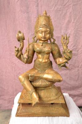 | Description / विवरण | Devi sitting on padma pettam with four hands. Left leg folded and the right leg in hanging position. Upper hands carry Damaru and Sula while the lower hands carry sword and kapala. Jwala makutam on the head. |