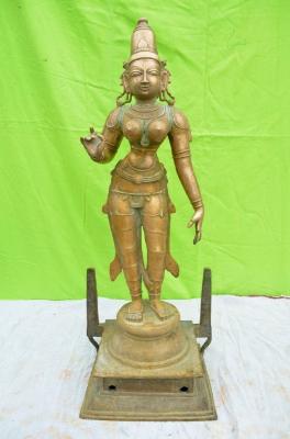 | Description / विवरण | Standing in tribanga posture on the padma peetam. Wearing karanta makuta having 2 hands. Right hand shows the kataka mutra and the left hand in lola hastha pose. Devoid of kuja bhanda |