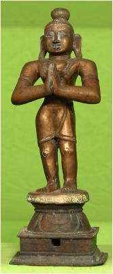 | Description / विवरण | Standing on padma peetam with anjali hastha posture. Bun shaped hair style is found on the head. |