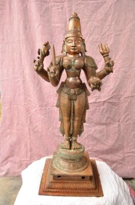 | Description / विवरण | Devi standing on padma pettam with four hands. Upper hands carry Ankusa and Sula while the lower hands carry sword and kapala. Wearing Kirita makutam on the head. |