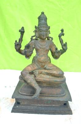 | Description / विवरण | Sitting in sugasanaPosture on the padma peetam. Left leg folded and the right leg in hanging position. Wearing Karanta makuta Having four hands. The upper hand holds parasu and antelope. Lower hands shows the kataka and varadha mutras.Devoid of kuja bhanda. |