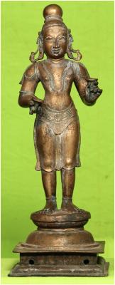 | Description / विवरण | Standing on padma peetam with talams musical instruments in the two hands. Bun shaped hair dress is found on the head. Long ears with makara kundala. |